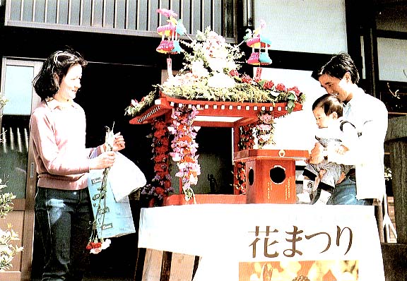 甘茶の接待、花のプレゼントなどもあり、子供達のお参りも多い。