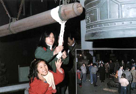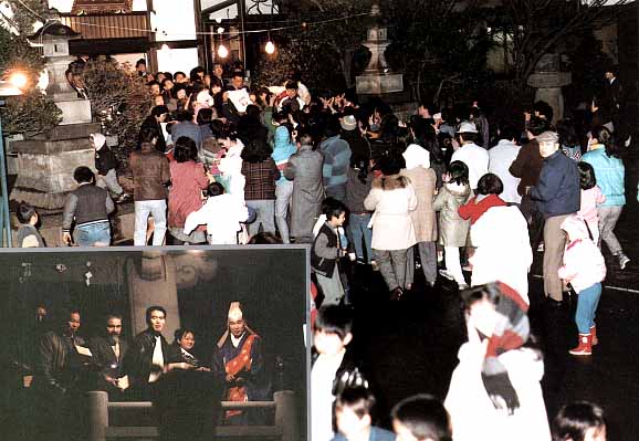 境内一杯の参詣者が集まり、賑やかに新年を迎える。